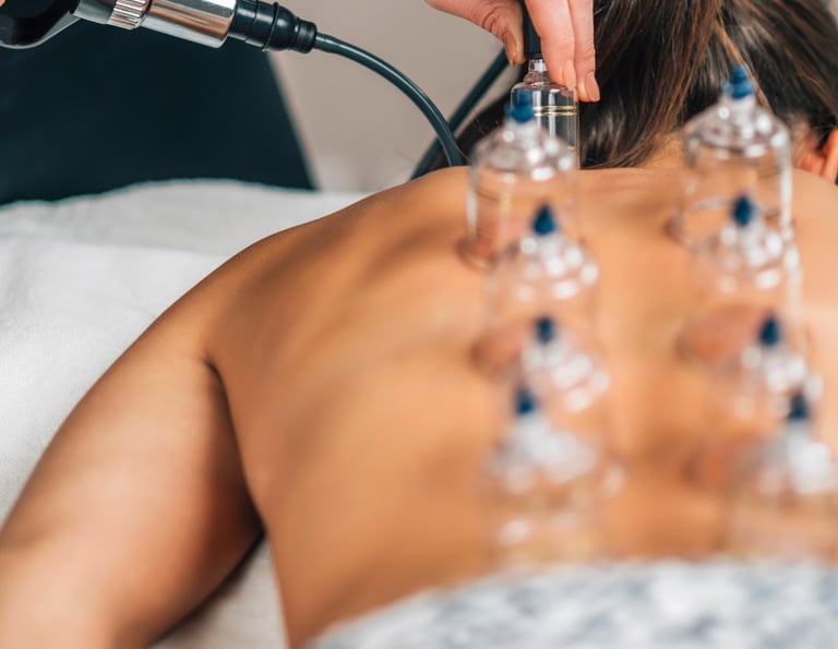Cupping massage is a therapy that uses special cups placed on the skin to create suction. The suction lifts the skin and underlying tissue to improve circulation, relieve muscle tension, and promote healing.